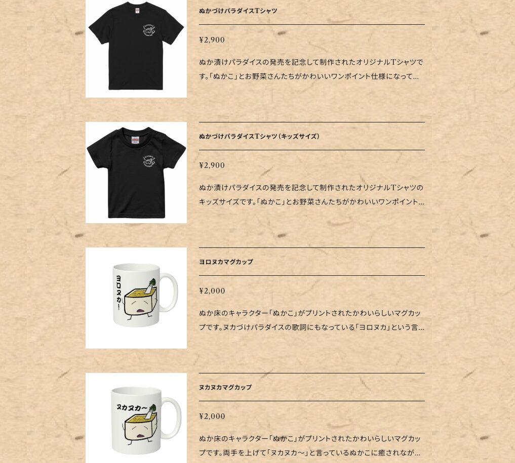 ショップでは、ぬかづけパラダイスの世界観を楽しめるアパレルやグッズを展開しています。